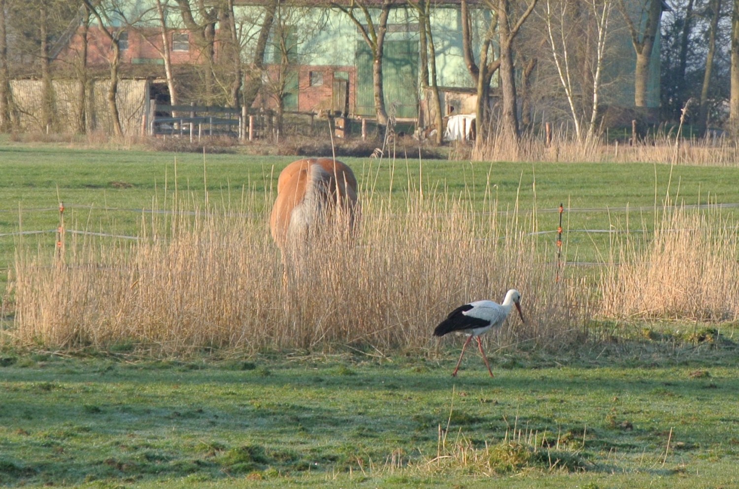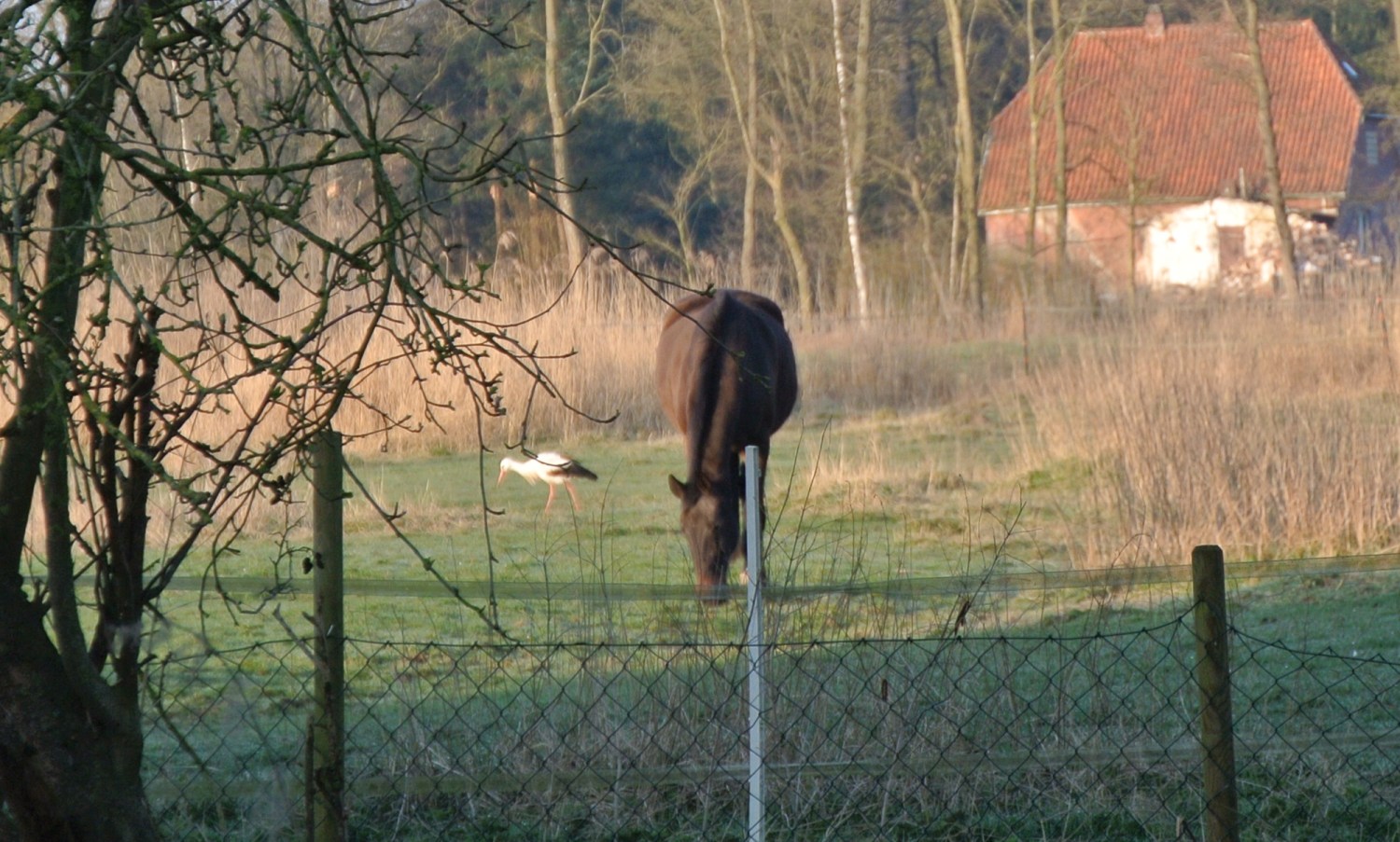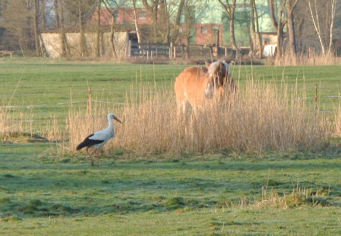 Der Wallach bemerkte den Storch, stand sofort auf dem Paddock und schnaubte aufgeregt. Er konnte offensichtlich nicht verstehen, was das für ein komischer Typ war, der mit einem Frack gekleidet, erhobenen Hauptes, auf unserer Weide herumstolzierte.