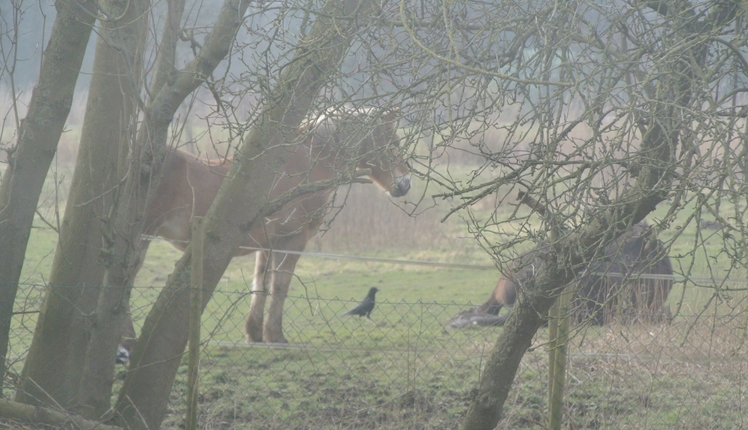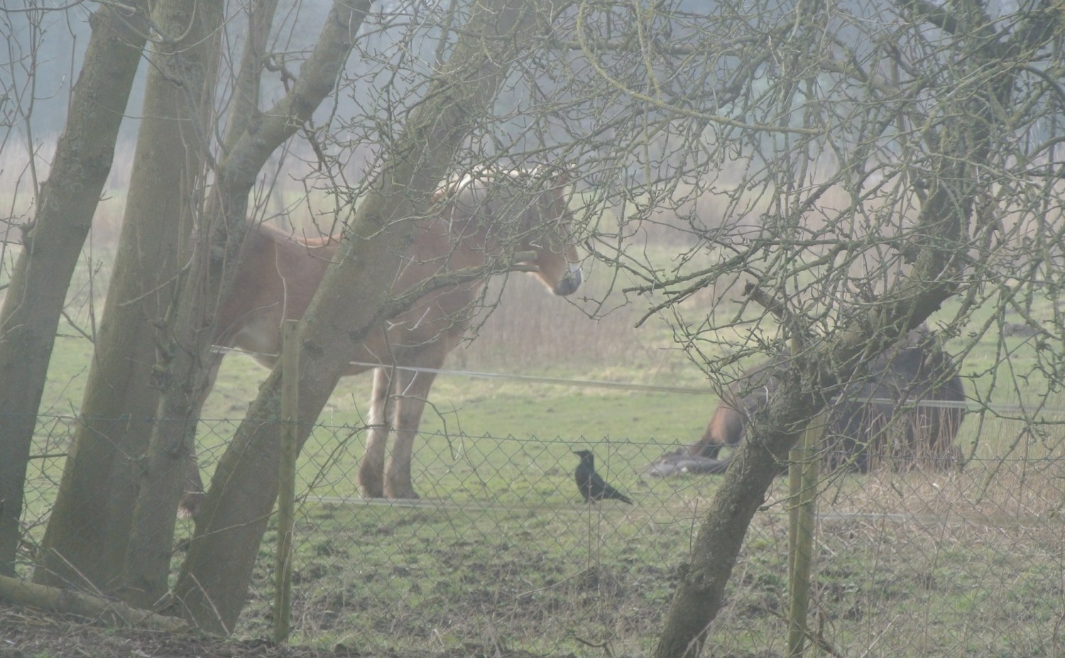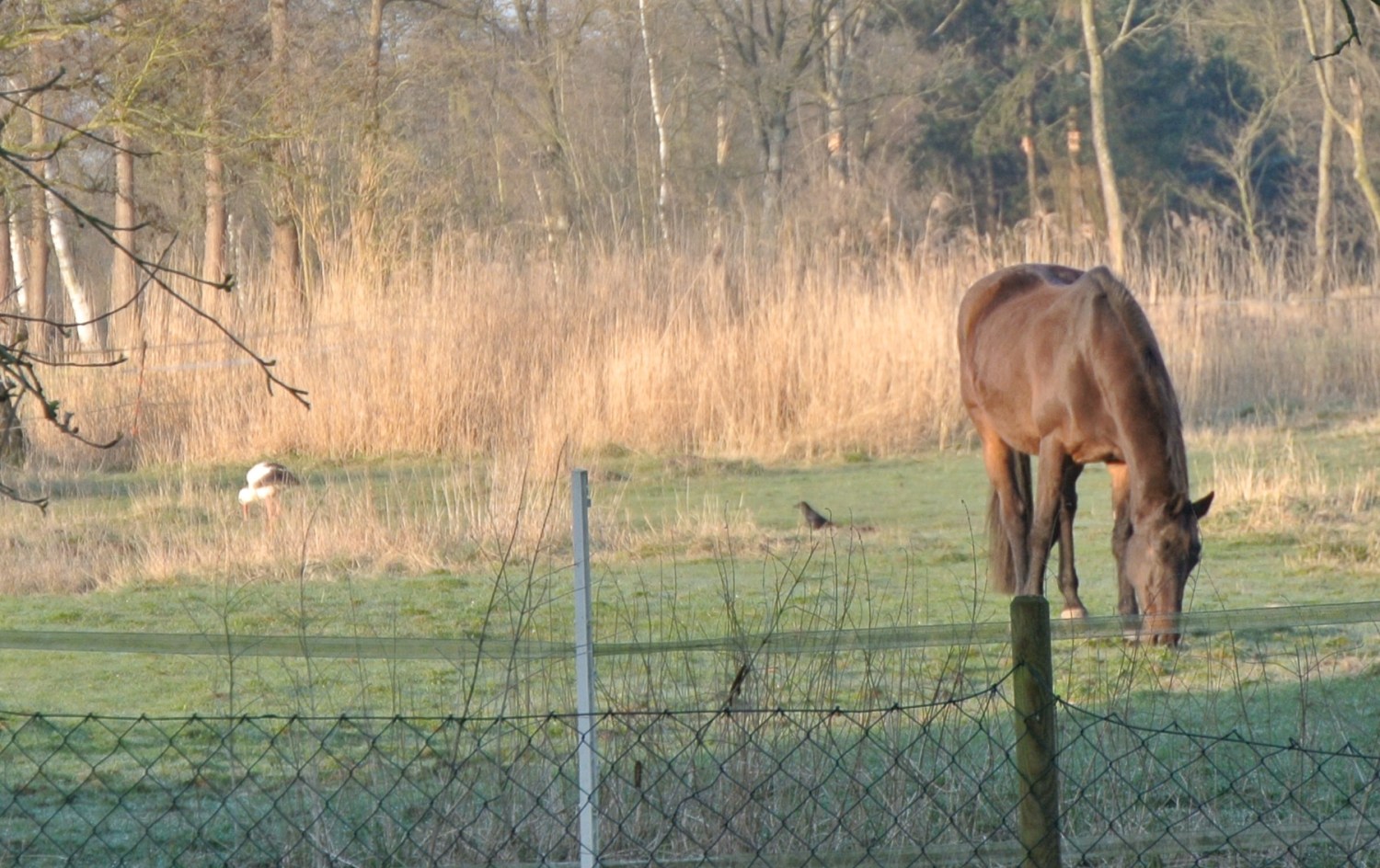 Der Wallach bemerkte den Storch, stand sofort auf dem Paddock und schnaubte aufgeregt. Er konnte offensichtlich nicht verstehen, was das für ein komischer Typ war, der mit einem Frack gekleidet, erhobenen Hauptes, auf unserer Weide herumstolzierte.