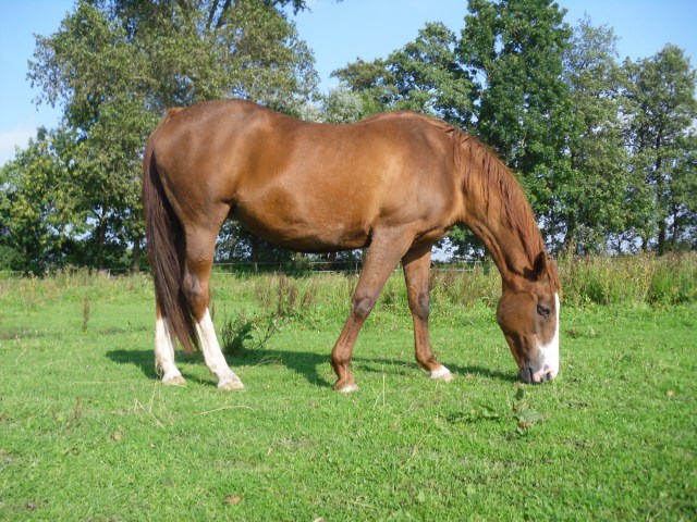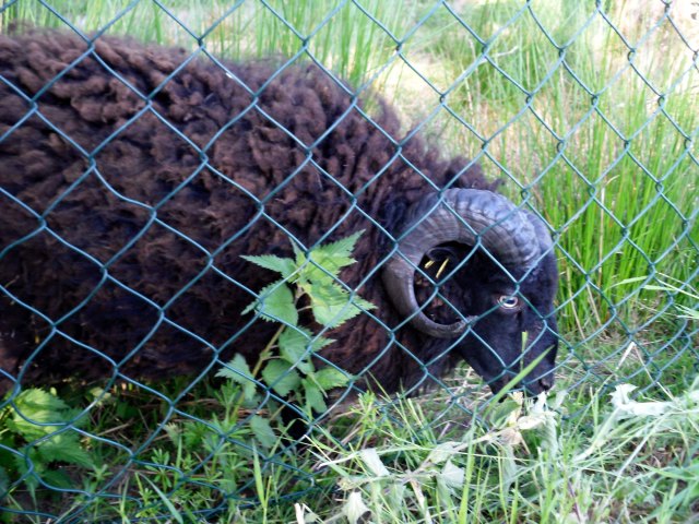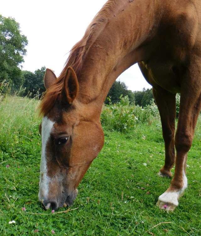 Der Wallach ist so groß, er hängt einfach seinen Kopf über den Maschendrahtzaun und frisst die Binsen die bei den Schafen hinter dem Zaun stehen. Normalerweise fressen Weidetiere keine Binse.