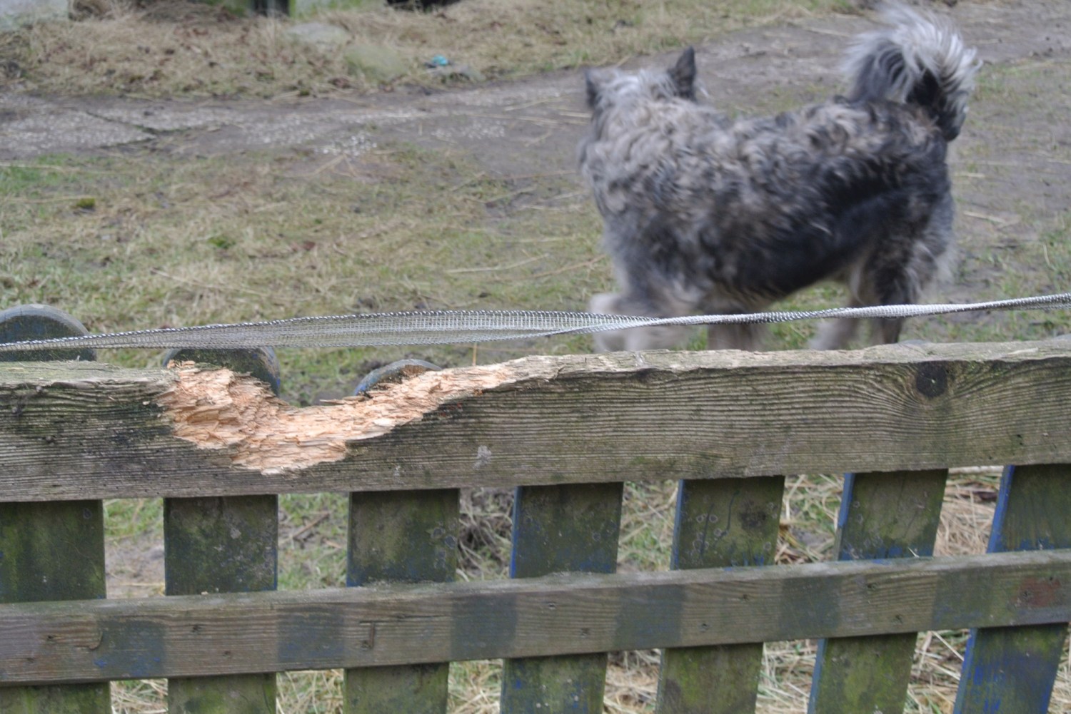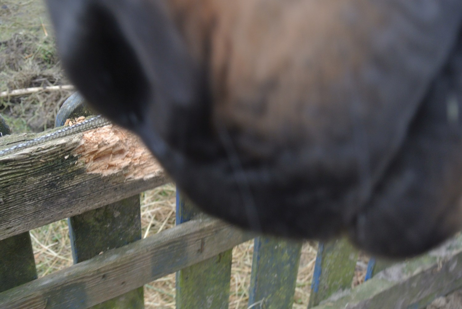 Nach getaner Arbeit waren wir froh, alles repariert zu haben. Doch was muss ich heute Morgen sehen? Limerick hat das Gatter angenagt!