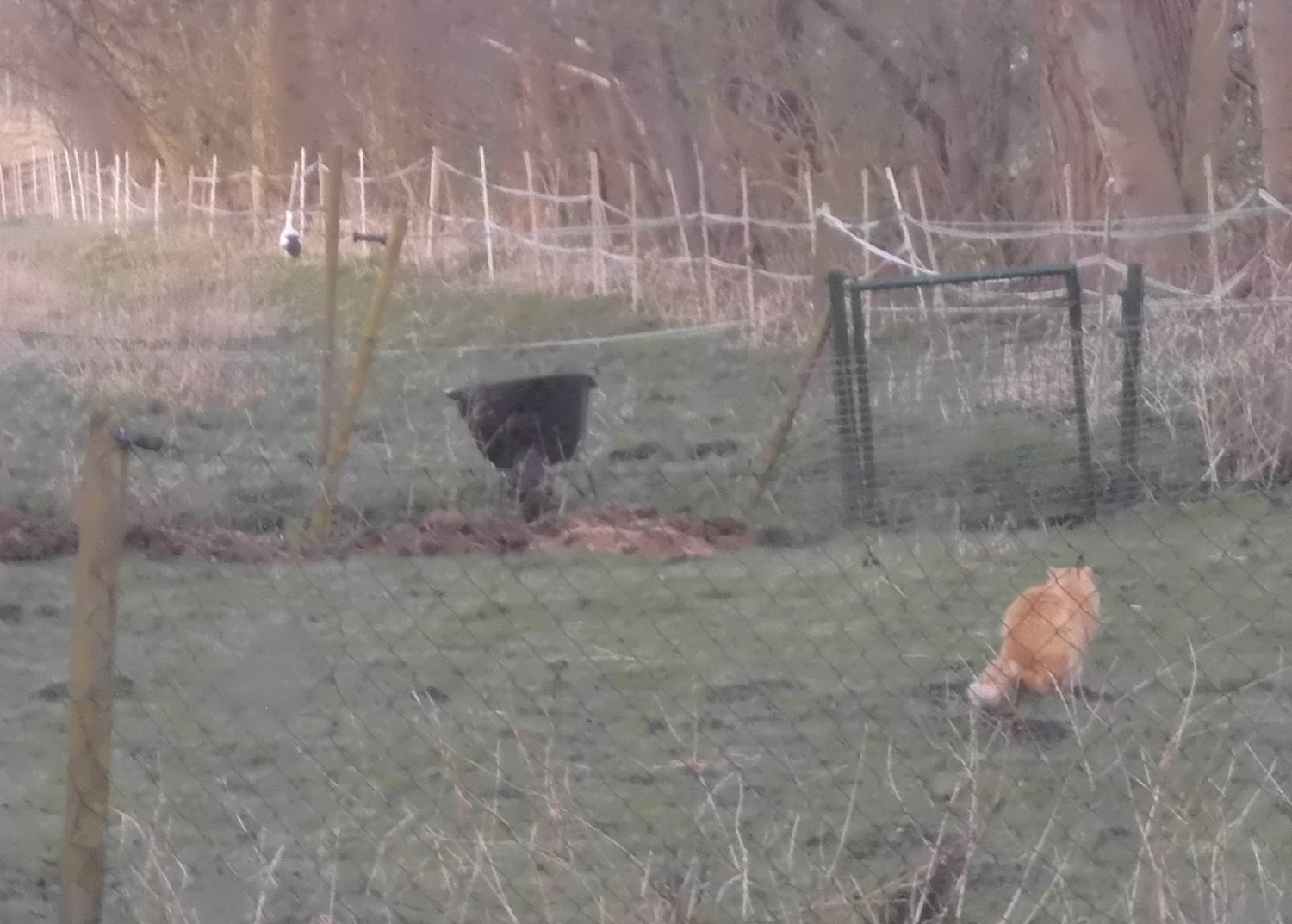 Der Storch spazierte ganz gerade am Weidezaun entlang, unter den misstrauischen Blicken des Katers.