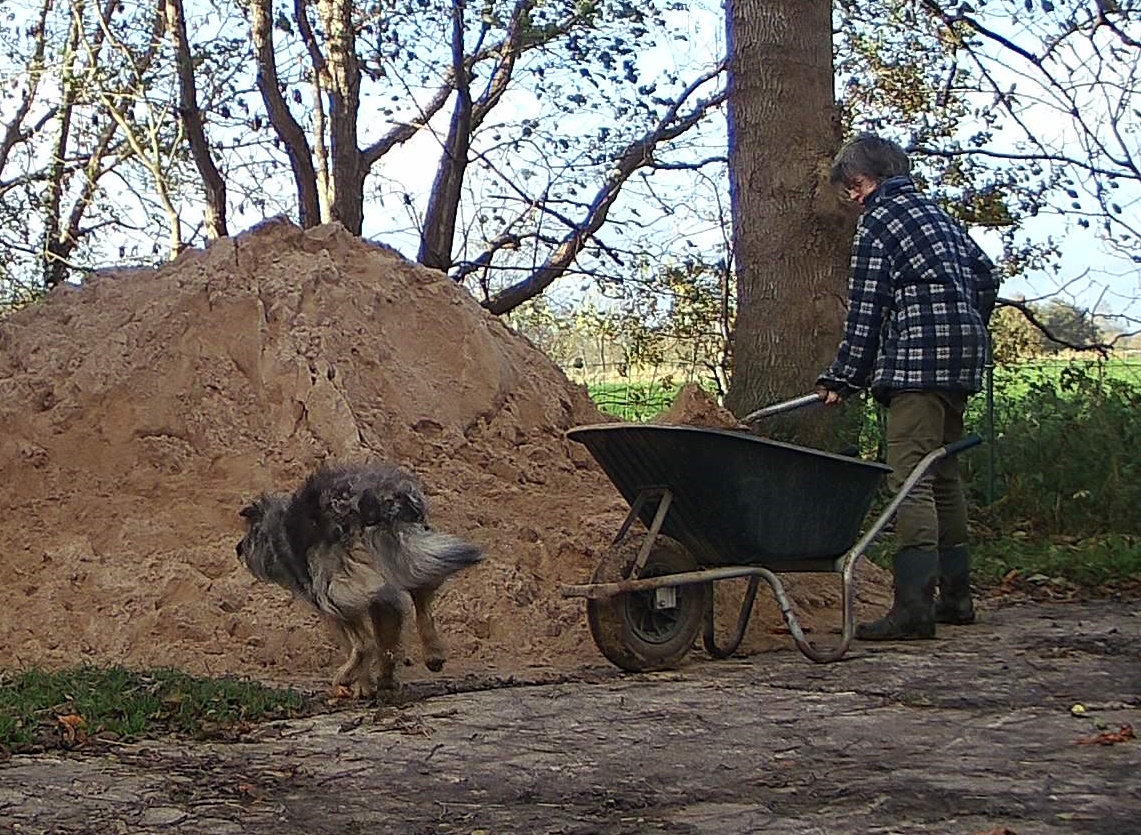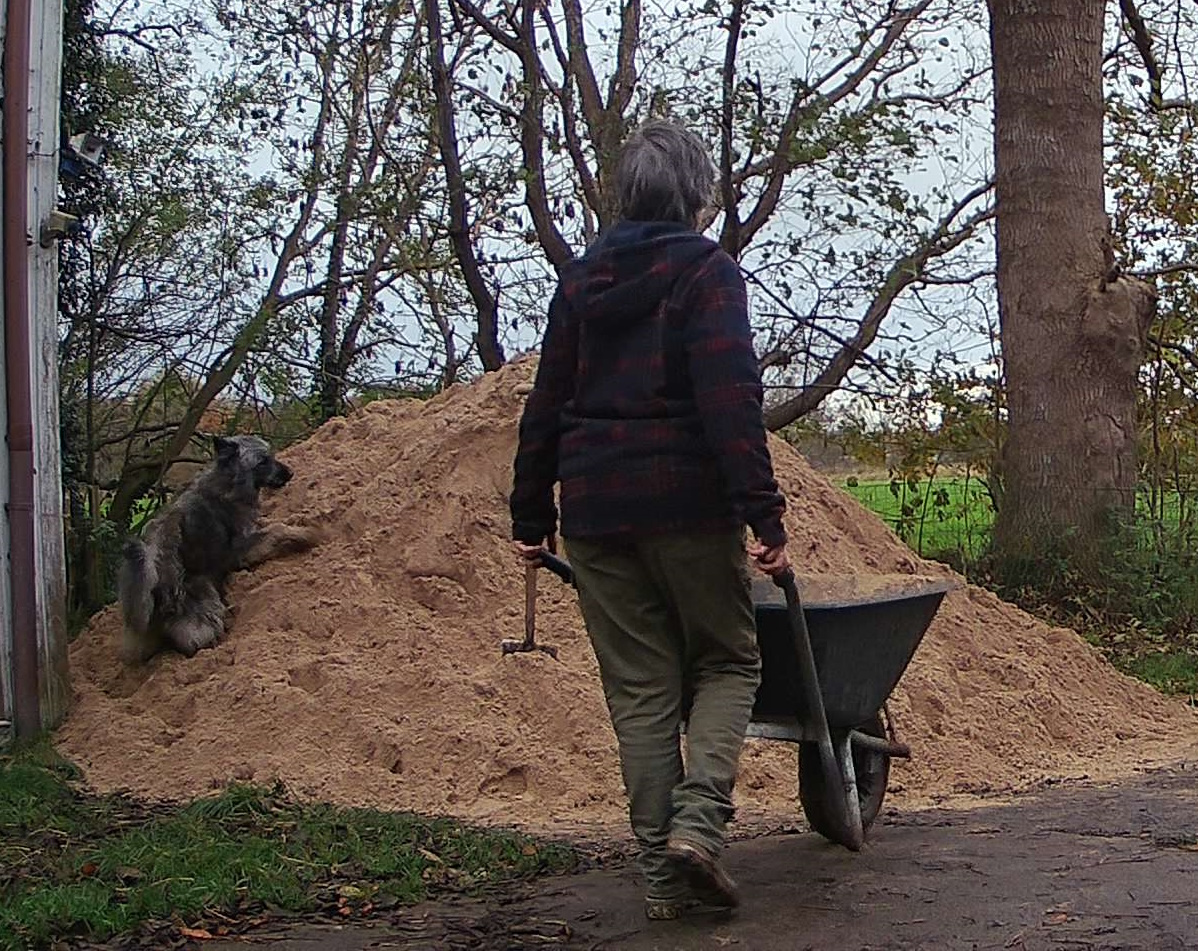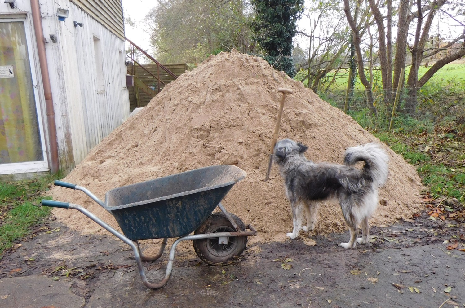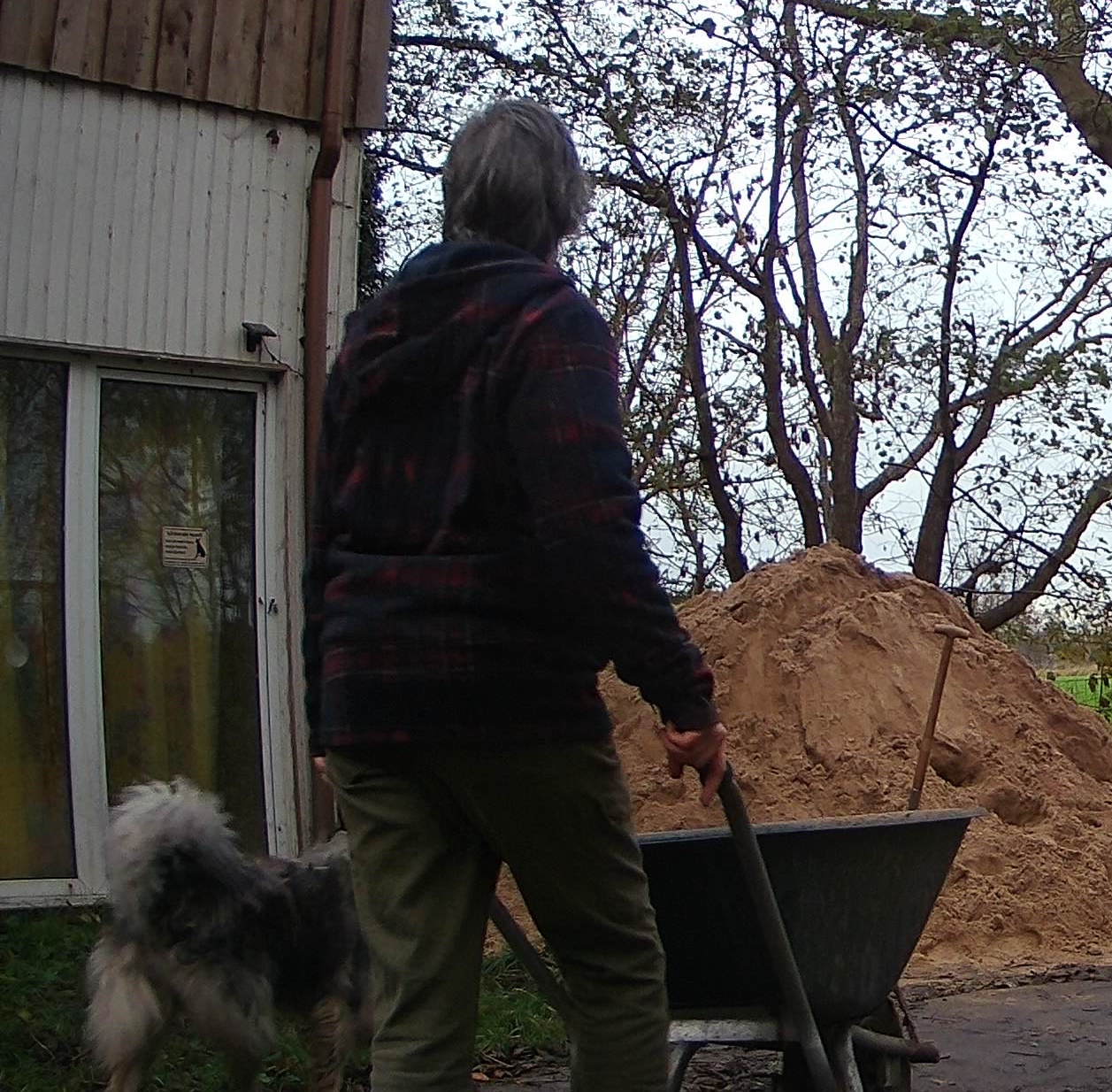 Damit wollen wir Stall und Paddock ausbessern. Das ist immer mal wieder nötig. Leider hat es die letzten Monate sehr viel geregnet, sodass wir den Sand nur per Schubkarre verteilen können.